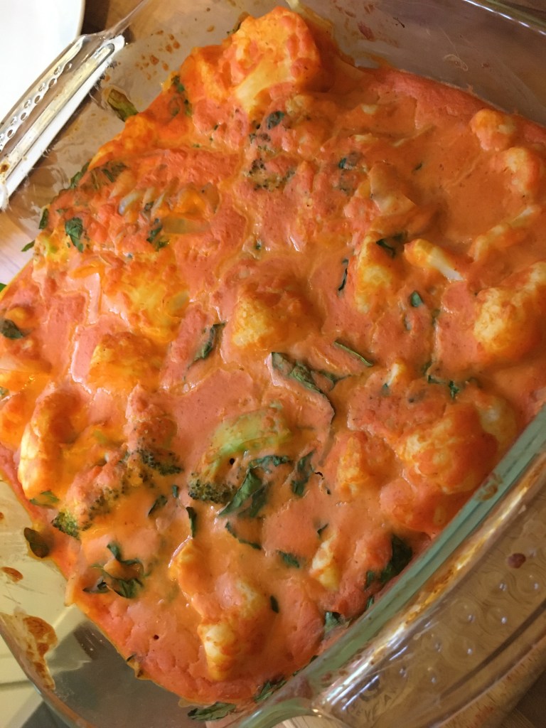 3 – Place the cauliflower, onion and spinach in a baking dish, approximately 9- 11 inches wide. Mix the veg with a spatula to evenly spread the veg.